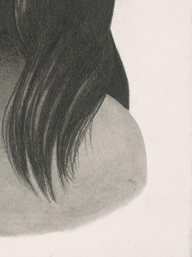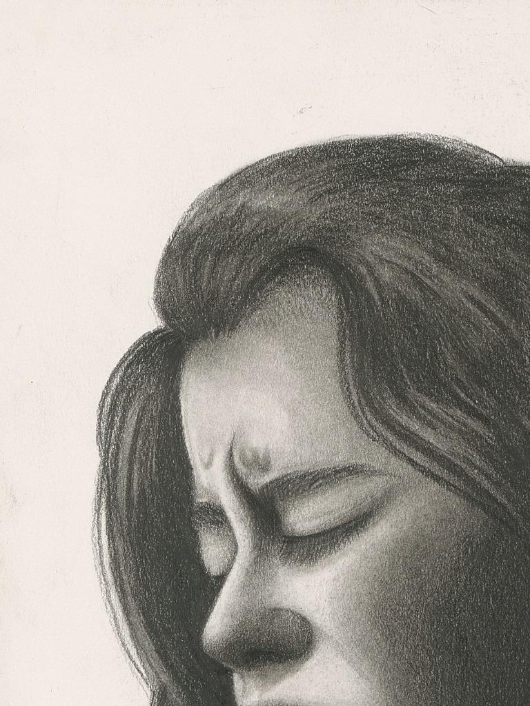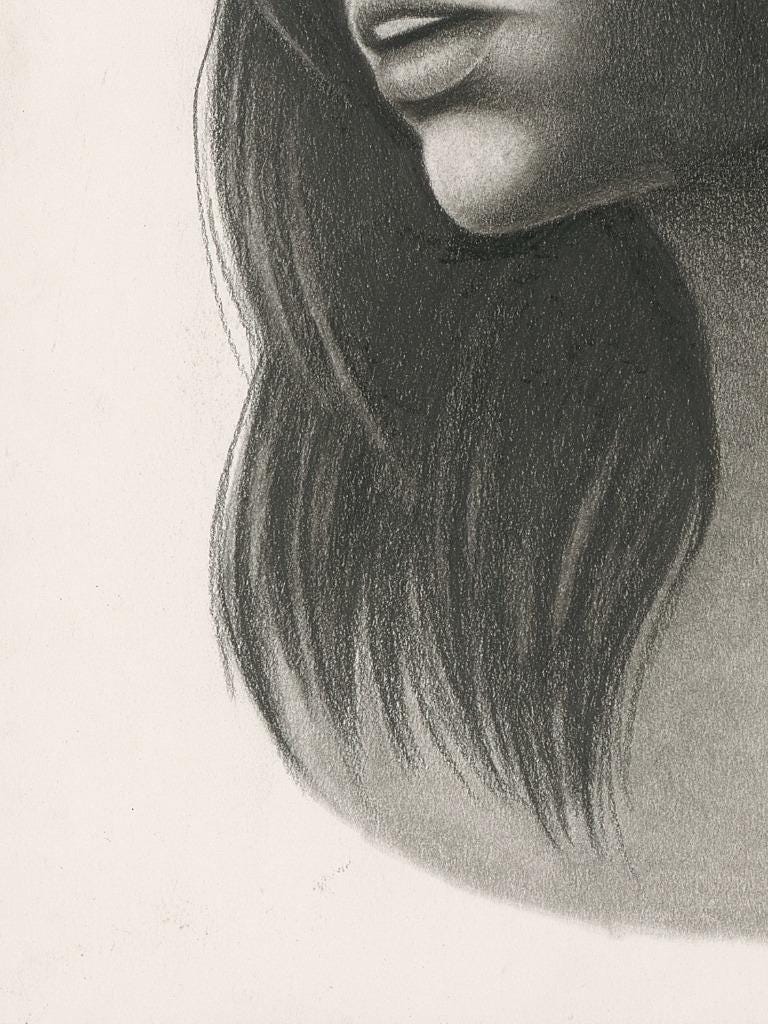 Created entirely with graphite pencil on paper, this piece focuses on subtle shading, soft transitions, and detailed hair texture to create depth and realism. The monochromatic palette enhances the intimacy of the subject, drawing attention to the raw emotion in her expression.