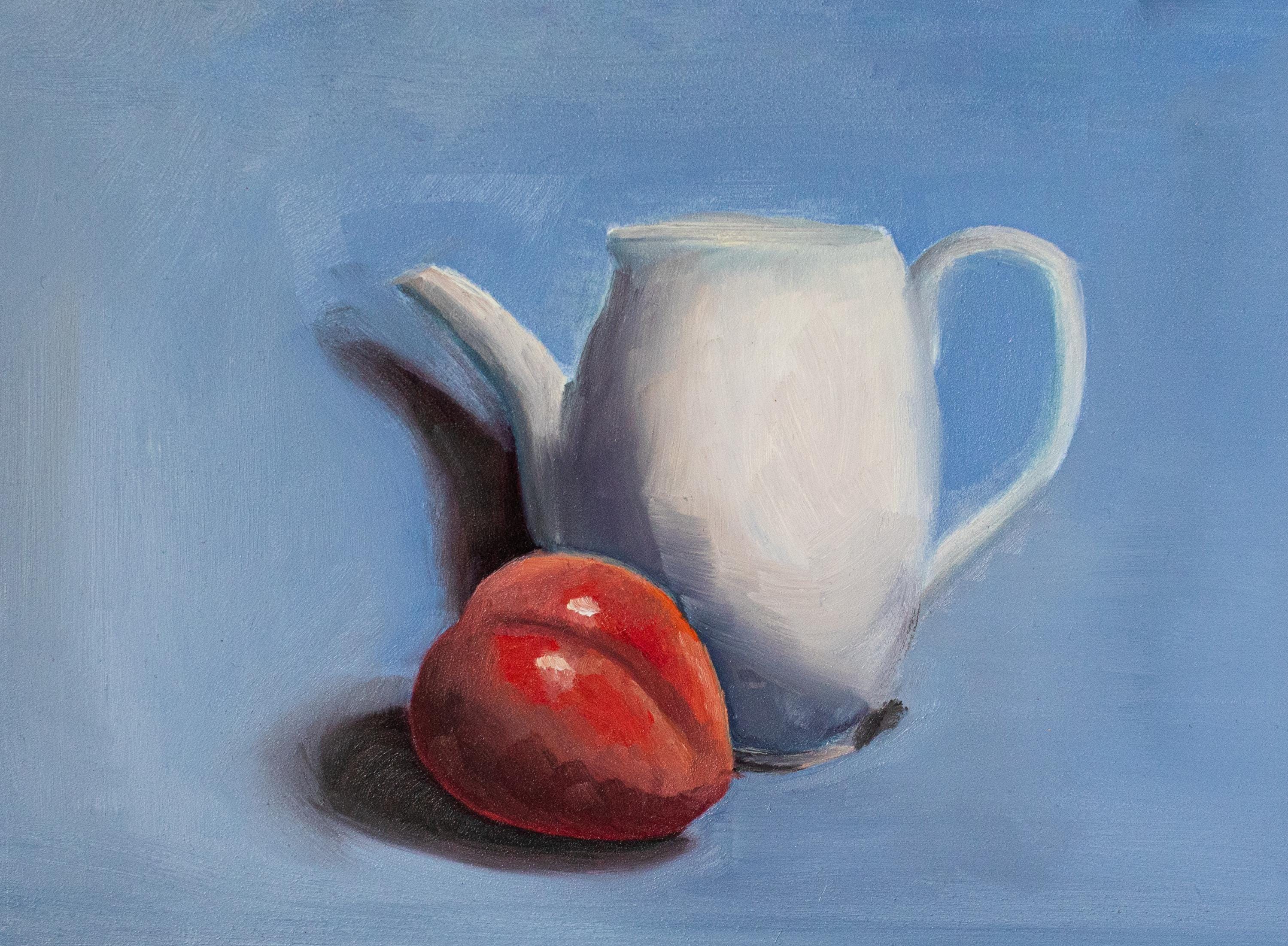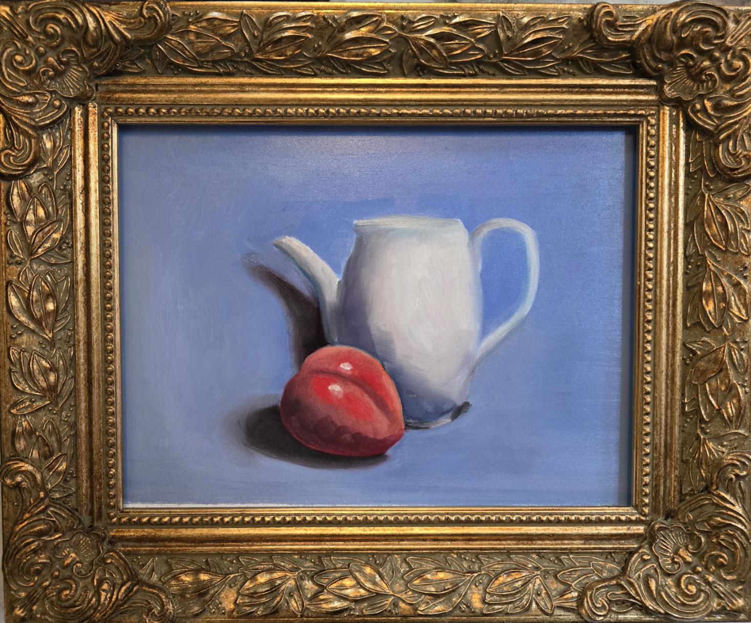 Bring timeless elegance and painterly charm into your home with this original 9x12 inch oil painting on panel, featuring a serene still life of a white ceramic pitcher and a richly colored plum resting against a soft blue background. This piece is painted in traditional oils with attention to light, color harmony, and subtle realism—perfect for collectors, art lovers, and anyone who appreciates classic fine-art techniques.