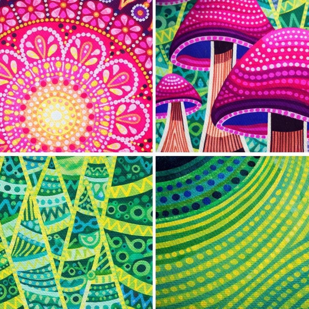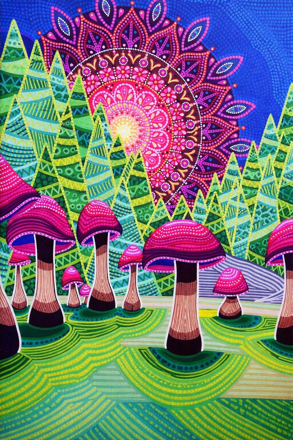 Perfect for lovers of psychedelic artwork, trippy nature scenes, visionary art, mushroom art, fantasy landscapes, mandala-inspired décor, and color-saturated wall art, this piece brings electric movement and dreamlike intensity to any room.