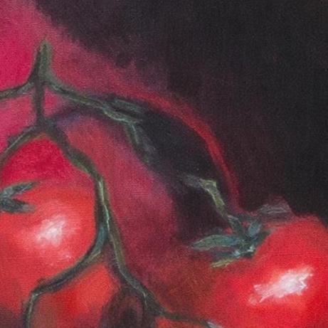 Painted with a focus on light, texture, and form, this piece blends realism with expressive softness. The glossy surfaces of the tomatoes, the velvety backdrop, and the quiet shadows all work together to create a sense of warmth and depth. It’s the kind of artwork that brightens a kitchen, dining space, or gallery wall with both elegance and a hint of drama.
