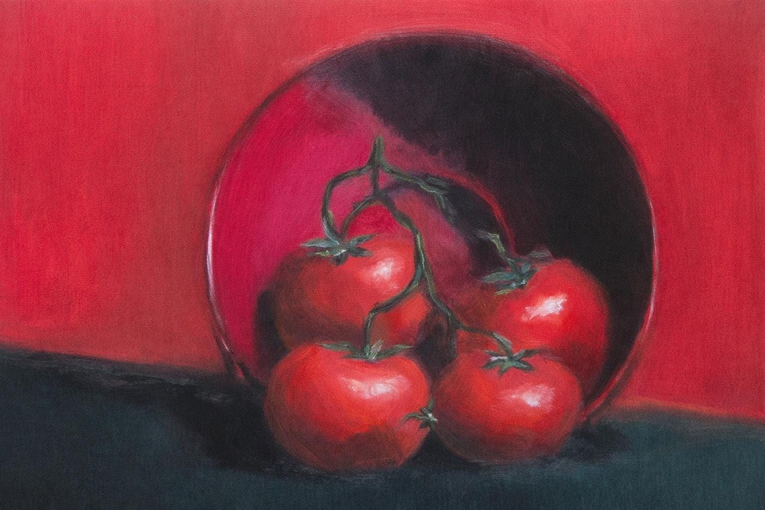 This vibrant still-life painting captures a rich, atmospheric moment: a cluster of ripe tomatoes resting gently on the vine, framed by the dramatic curve of a deep red bowl. The composition is a celebration of color harmony—warm reds layered over cool shadows, with subtle variations in tone bringing each tomato to life.