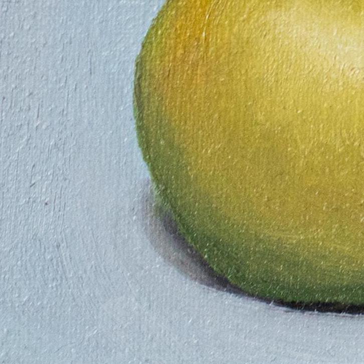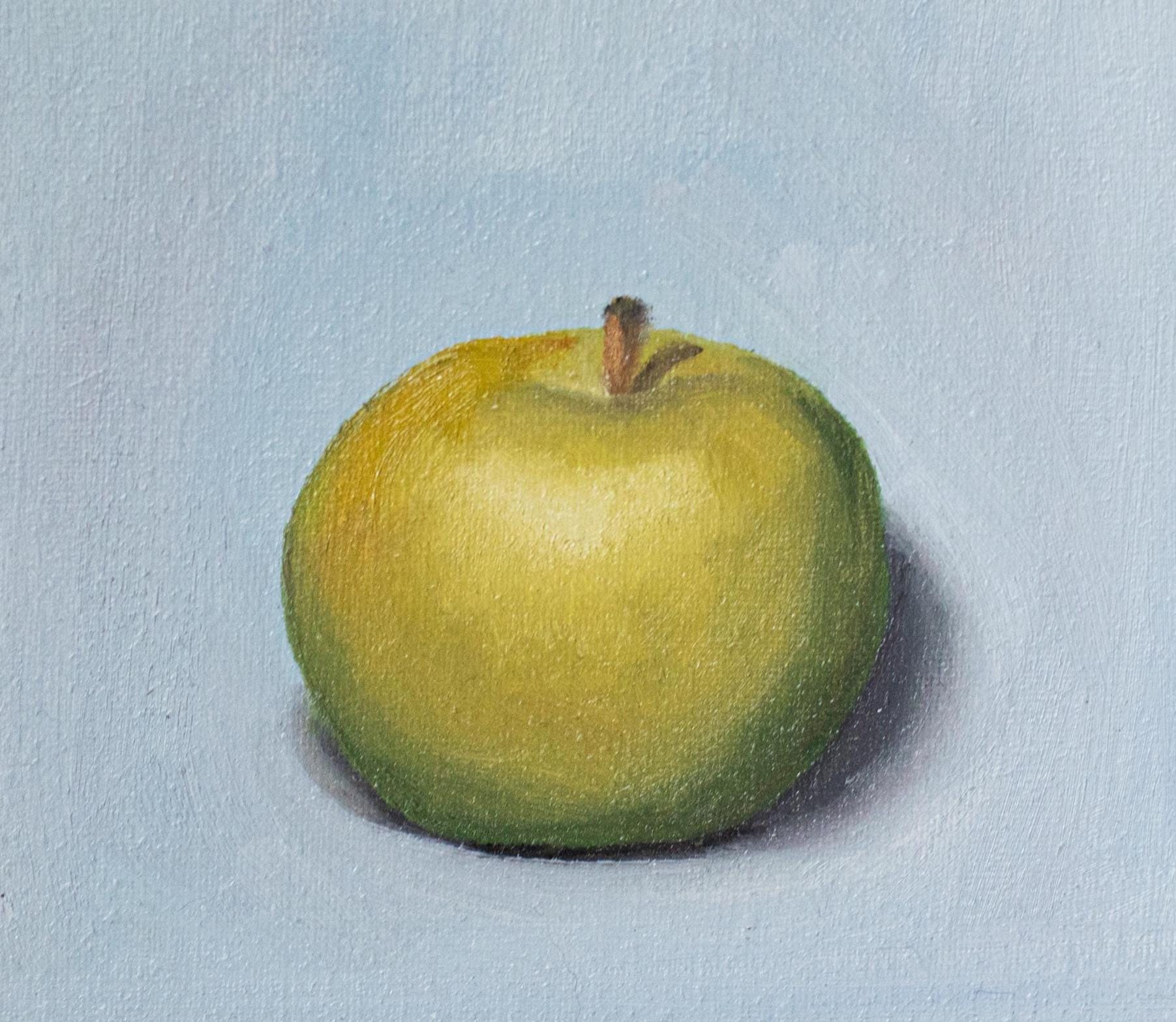 This charming 8x10 inch oil painting is a quiet and elegant color study of a single golden-green apple, painted from life with soft, naturalistic detail. The subtle transitions of light and shadow, paired with the gentle blue background, create a serene composition that highlights the beauty of simple objects.