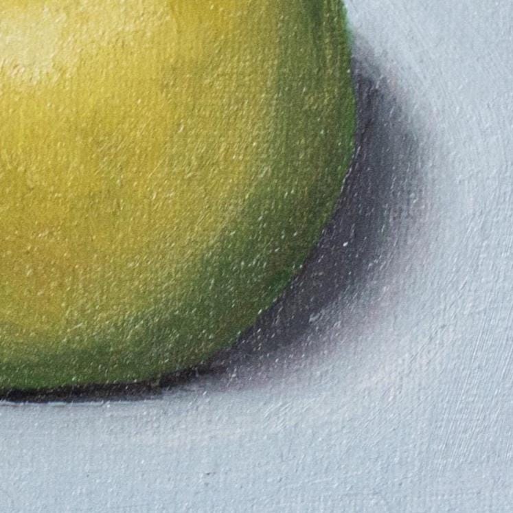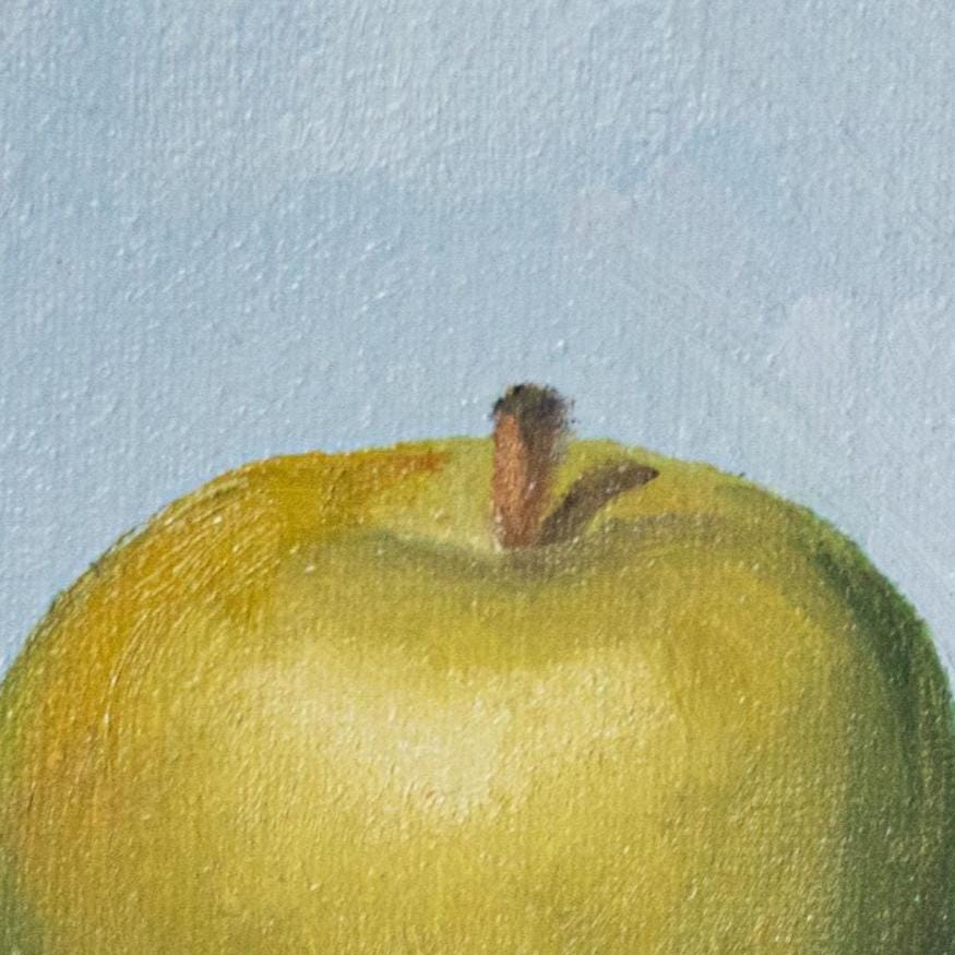 The apple’s surface is built through layered brushwork—warm yellows, cool greens, and delicate highlights—giving it a lifelike glow. The soft shadow beneath anchors it to the surface, while the intentionally loose, painterly edges around the background add a contemporary touch.