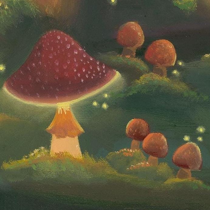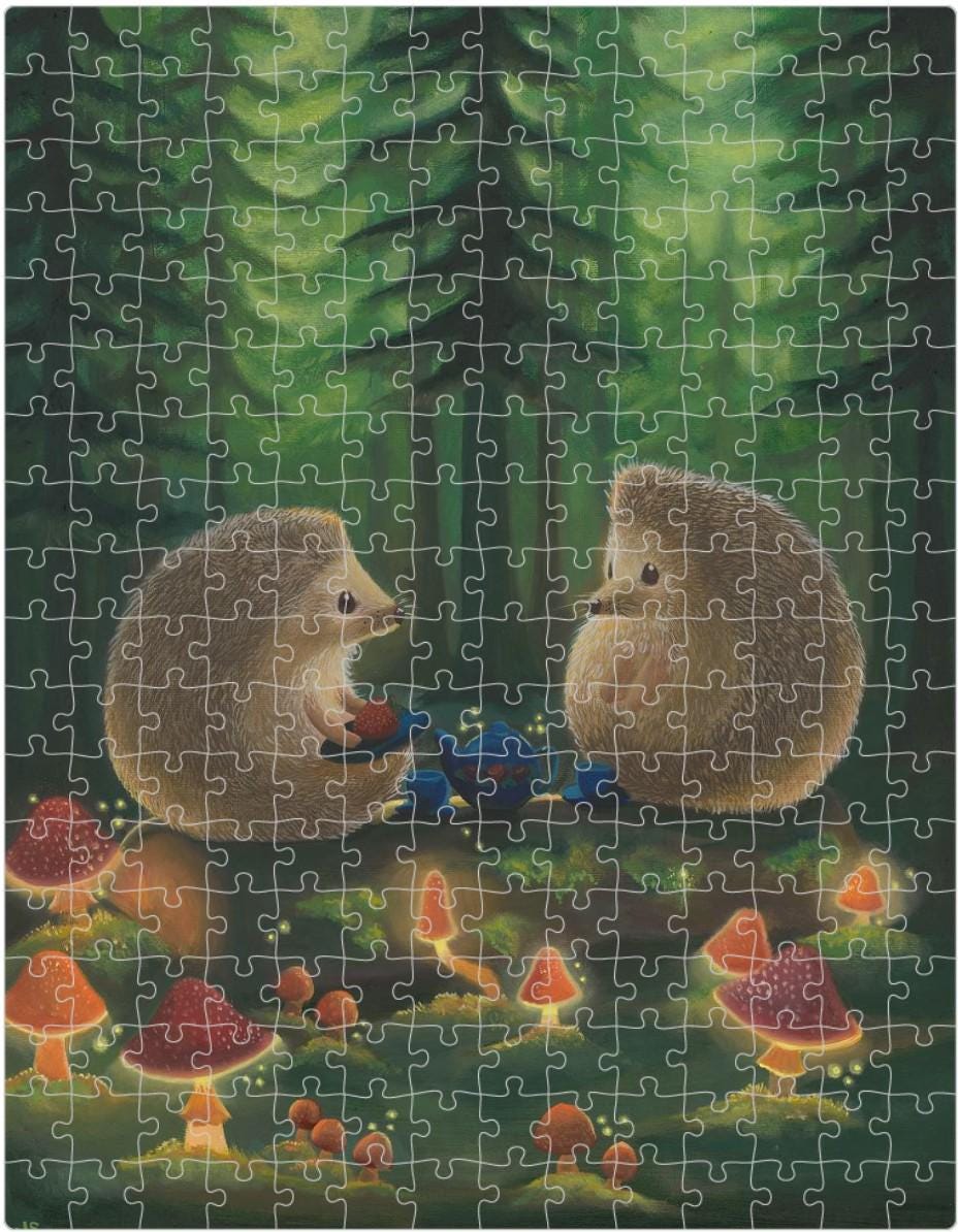 Step into a magical forest where two round, fuzzy hedgehogs sit down for the tiniest, most important tea party in woodland history. This 252-piece puzzle features my original oil painting, bursting with glowing mushrooms, forest ambiance, and hedgehog diplomacy at its finest.