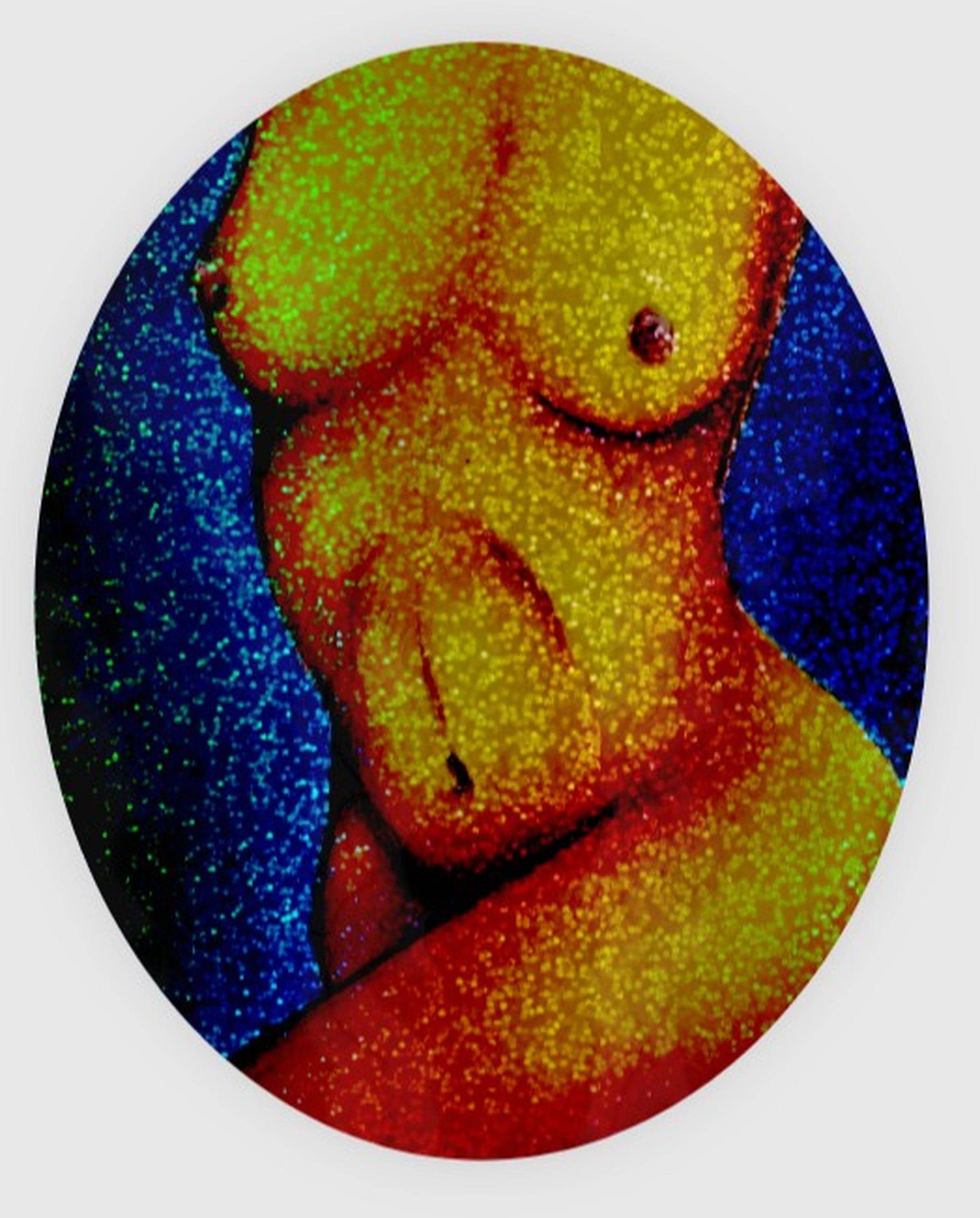 The body is rendered using layered pencil shading and then transformed with vibrant reds, yellows, and blues that give the figure a glowing, almost dreamlike quality. Printed with a pixie dust glitter effect, the surface catches the light with a subtle sparkle that enhances the color transitions and gives the piece extra depth.